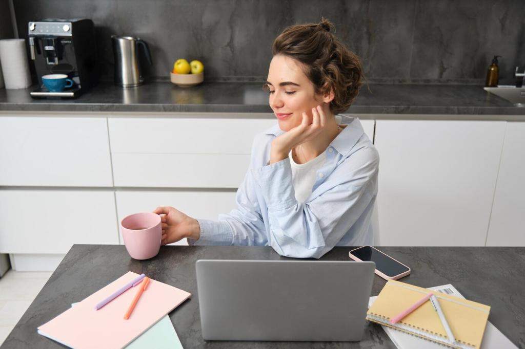 Stelle Wasser bereit, schließe überflüssige Programme, öffne nur die Arbeitsdatei, und notiere die erste Mikroaufgabe. Dieser kleine Ablauf nimmt Anlaufangst, überwindet Trägheit und markiert den klaren Beginn.